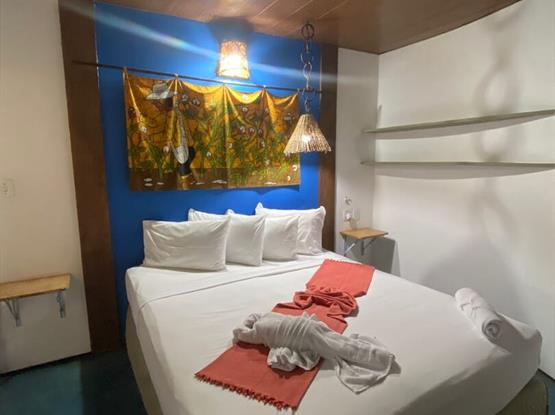Bangalô com varanda duplo:Localizados no térreo e 1º andar na área externa da pousada e com proximidade maior do mar, possui quarto com 12 m² oferece um quarto com 01 cama Box casal com colchão de mola, ar-condicionado Split, TV Smart de 32” no quarto, cofre eletrônico, banheiro com portas reversíveis e chuveiro elétrico, disponibilizamos de Shampoo, Condicionador e Sabonete e Varal para secar roupas