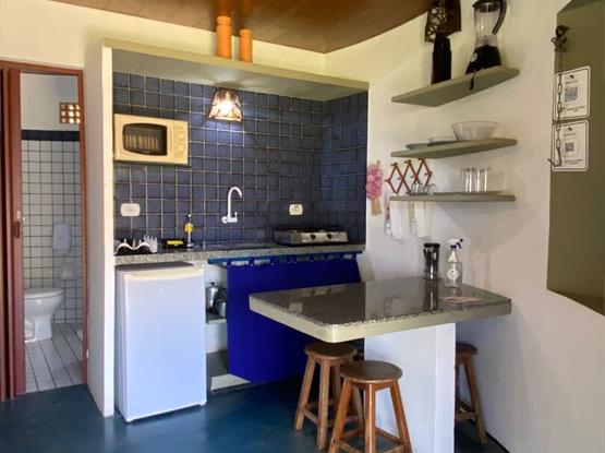Cozinha estilo americana, equipada com alguns utensílios domésticos para preparo de refeições rápidas, liquidificador, micro-ondas, fogão de 02 bocas e frigobar.