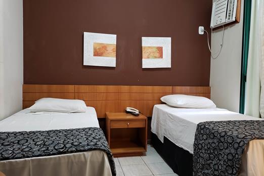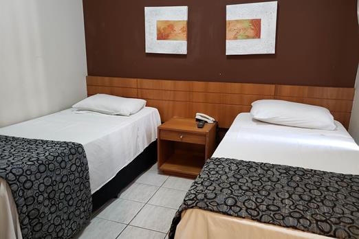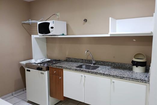 Quarto com duas camas de solteiro, varanda, sala de estar com sofá de dois lugares, banheiro privativo, chuveiro com água quente, secador de cabelo, pequena cozinha com frigobar, micro-ondas, ar condicionado no quarto, internet wi-fi gratuita e TV a cabo. A cozinha tem dois copos, dois pratos, dois talheres e duas xícaras, não tem panelas nem utensílios. O Frigobar não possuí nenhum item, os mesmos devem ser adquiridos em nossa recepção.