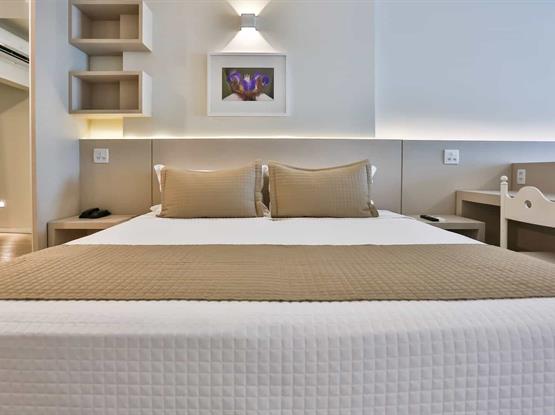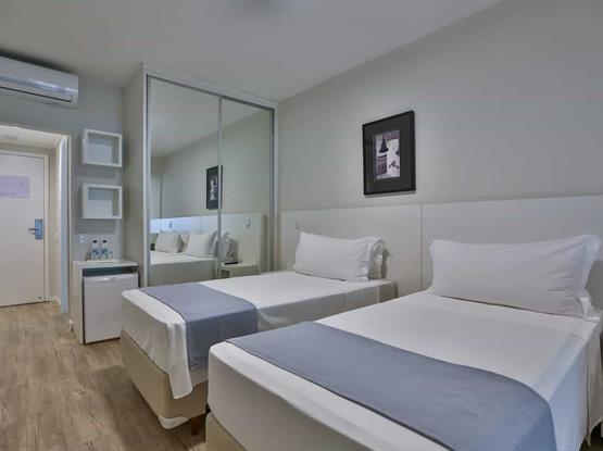 Mini-bar abastecido diariamente com os itens: 02 águas sem gás, 02 águas com gás, 02 Coca-cola Regular lata, 02 Coca-cola Zero lata.