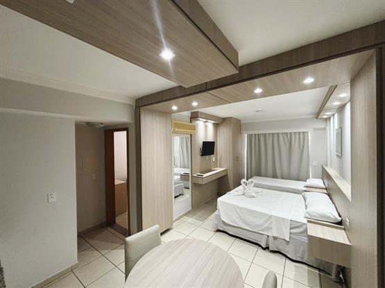 🛏️ Flat 1 Quarto Superior - LX5 - possui um quarto com duas camas box de solteiro (são unidas para formar a cama de casal), sala de estar com cama de casal + cama de solteiro, banheiro e sacada.