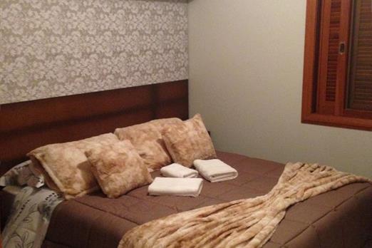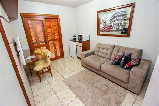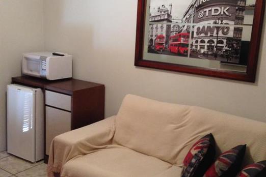 Possui um quarto com cama de casal e uma sala de estar com sofá cama de casal.