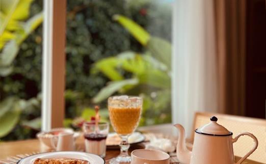 Café da manhã continental/regional (pães, frios, bolos, cereais, sucos, café, chá, água, embutidos, tapiocas, omeletes e waffles).