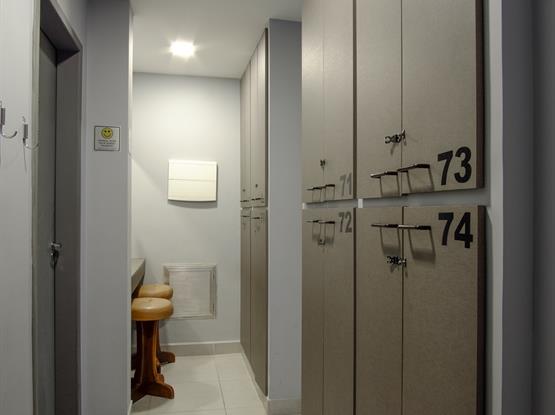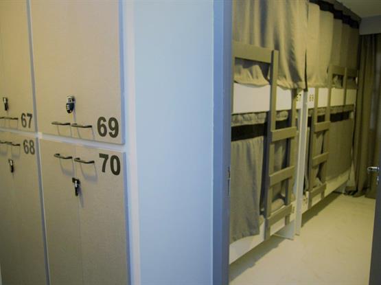 Quarto compartilhado com banheiro compartilhado. Este quarto possui 4 camas em beliches com cortinas para sua privacidade, um armário exclusivo para cada cama e ar condicionado. Esse quarto não possui janela.