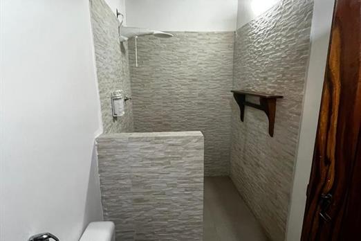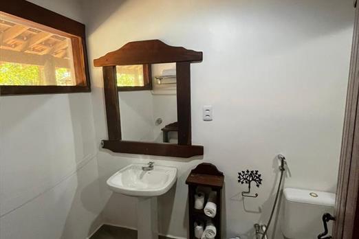 O banheiro está equipado com chuveiro elétrico, amenidades como shampoo e sabonete.