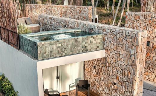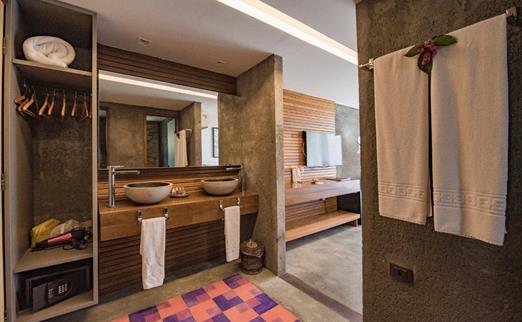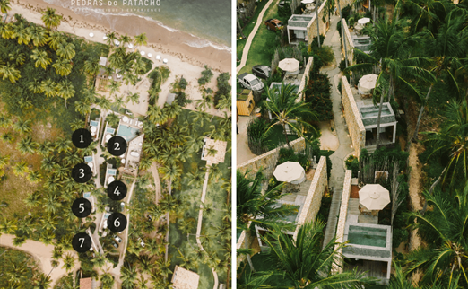 BANGALÔ 3 ou 4 ou 5 ou 6 ou 7 - 75,35 m² - vista parcial do mar através do rooftop - cama king size - varanda - rooftop individual - piscina privativa - ar condiconado - metais Hansgrohe - banho com aquecimento a gás - frigobar - amenidades costa brasil - tv a cabo - secador de cabelo - tapete de yoga - cofre - wi-fi - máquina de café expresso - mobiliário assinado por designers renomados - Localizada a no máximo 20 metros da praia, a mais ou menos 1 minuto de caminhada dentro do próprio hotel. - Piscina privativa localizada no primeiro andar (rooftop)...