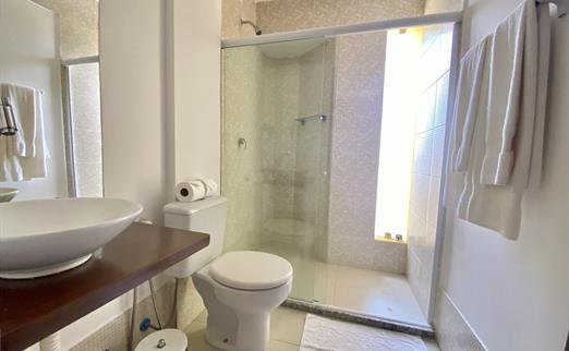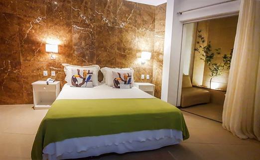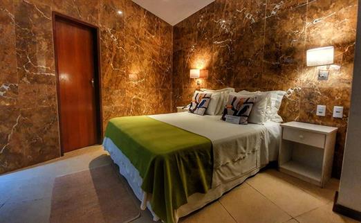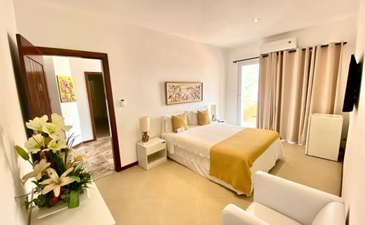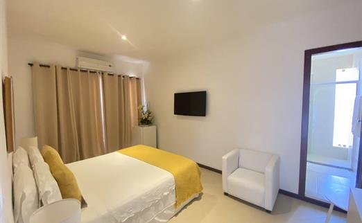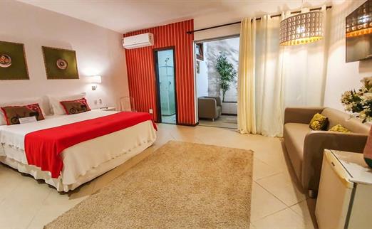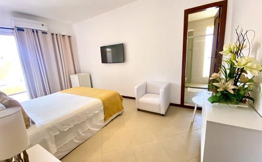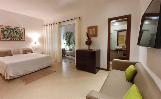 A suíte sem varanda, é uma charmosa acomodação criada a partir de um conceito de modernização e ambientação calorosa. Repleta de detalhes, tem em anexo ao quarto uma compacta sala de star com jardim de inverno, ideal para ser utilizada como opção de leitura e conversação. Nessa suite, pode-se acomodar duas pessoas em cama de casal e em algumas delas, até três pessoas sendo 01 cama de casal e 01 cama de solteiro, ou (ou sofá-cama). Localizada no térreo, próximo ao corredor da recepção, ou no primeiro andar, tem como comodidade: Ar-condicionado Split, tv de led com antena comum, frigobar, telefone interno, 01 de cama casal queen, c...