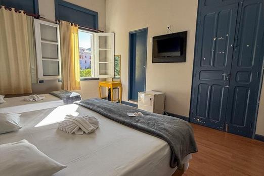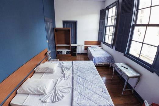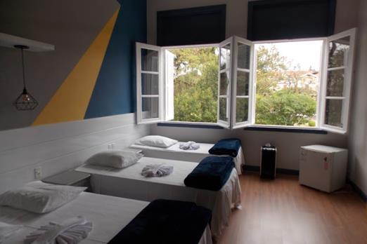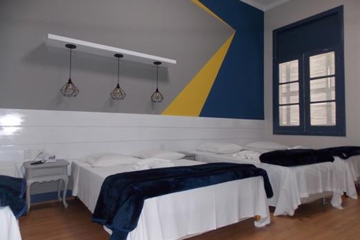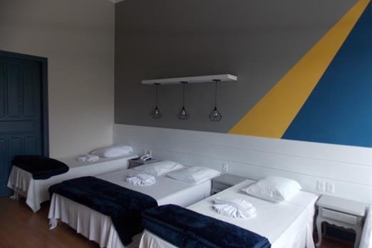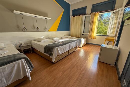 Quarto com uma cama de casal e duas de solteiro ou quatro camas de solteiro (É só nos informar qual opção de cama que você deseja), banheiro privativo com chuveiro elétrico, telefone, ventilador, guarda roupa, frigobar, televisão, roupas de cama, toalhas, travesseiros e cobertores, tudo preparado com muito carinho, para proporcionar o melhor conforto e bem-estar.