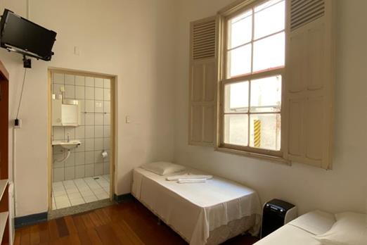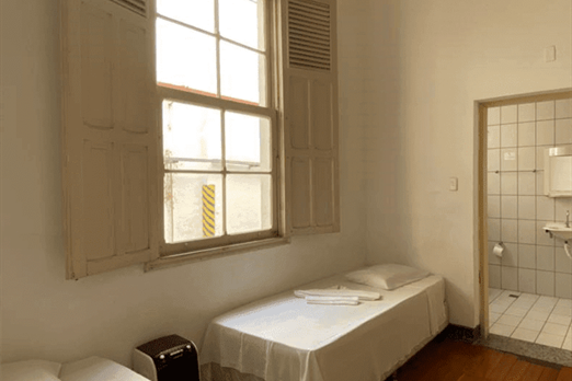 Quarto Simples no Térreo, com uma cama de casal e duas camas de solteiro ou quatro camas de solteiro, (É só nos informar qual opção de cama que você deseja), banheiro privativo com chuveiro elétrico, telefone, ventilador, guarda roupa, frigobar, televisão, roupas de cama, toalhas, travesseiros e cobertores, tudo preparado com muito carinho, para proporcionar o melhor conforto e bem-estar.