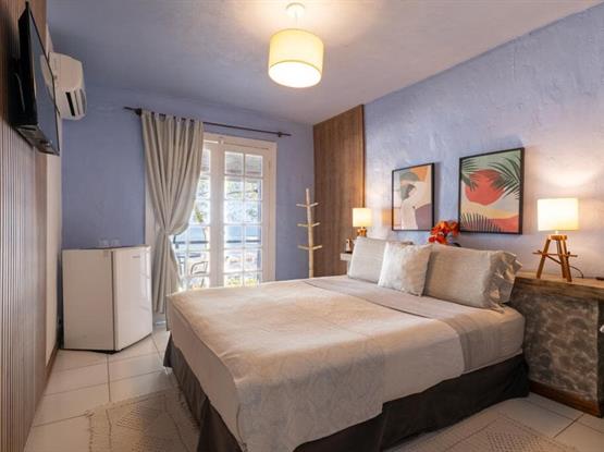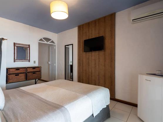 Vivencie nossa Suíte Superior com um espaço de 27m2, localizada no 2º andar, com uma varanda que se abre para magnífica vista azul da Praia de Geribá e que convida a momentos de relaxamento. Apresentando uma cama Queen Size, Ar-condicionado Split, TV LED de 32p, frigobar e amenidades e uma antessala com um sofá-cama.