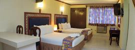Habitación con 2 camas matrimoniales, suelo de baldosa/mármol, baño privado y aire acondicionado.