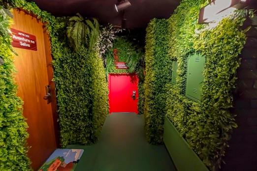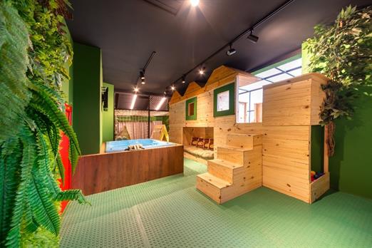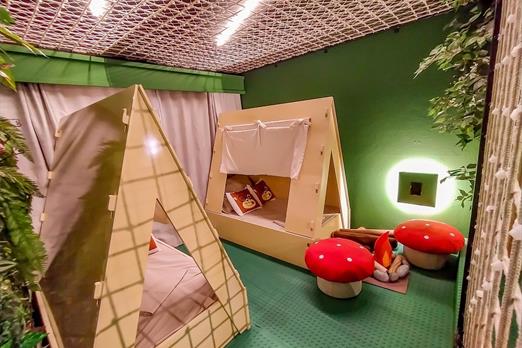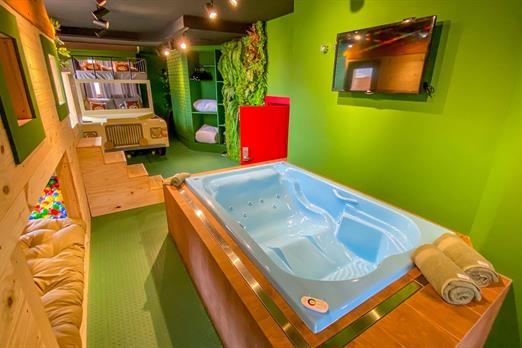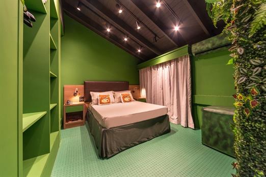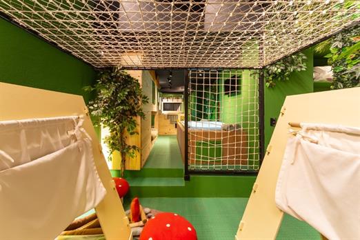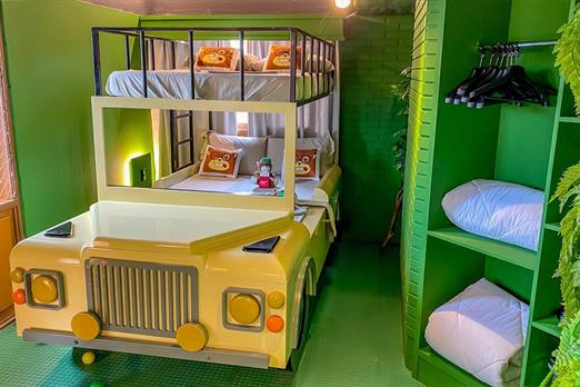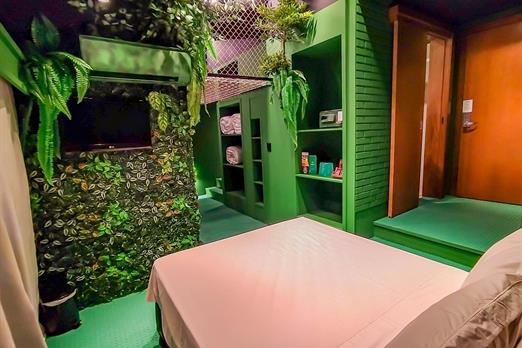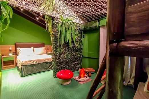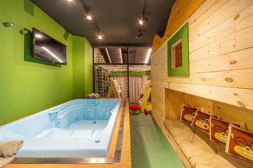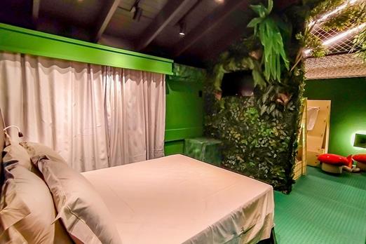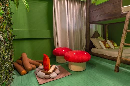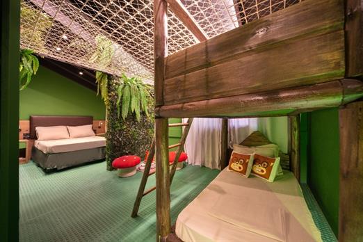 Telas nas alturas para brincadeiras, camas em forma de beliche e ambiente tematizado como selva. Tem capacidade para um casal + 2 crianças....