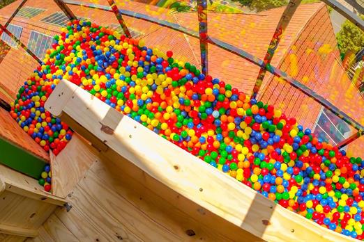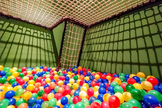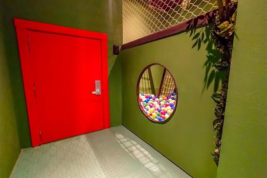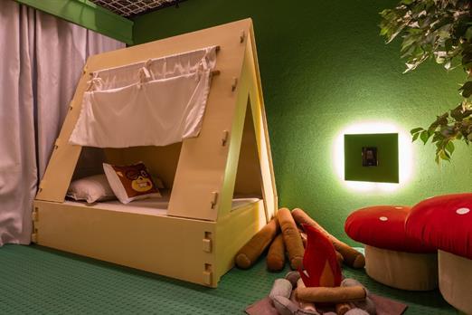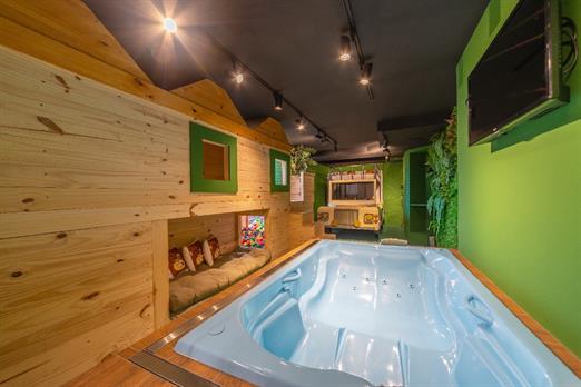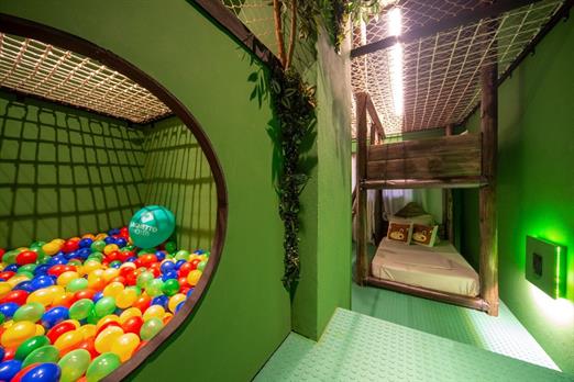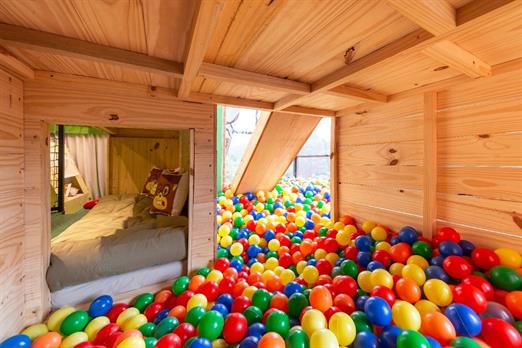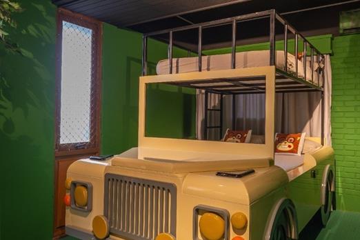 Super suíte, com beliche em forma de jeep, Camas dentro de barracas, piscina de bolinhas com escorregador, telas suspensas para brincadeira,...