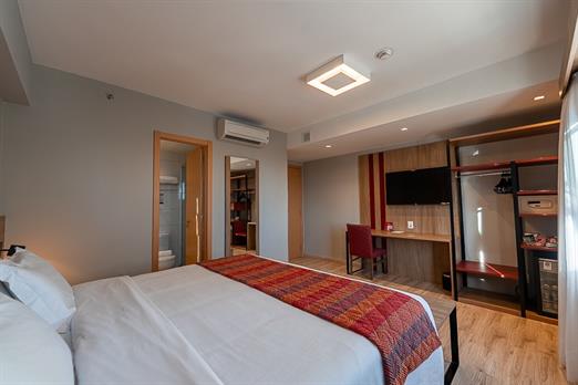Ar condicionado Split | Frigobar | Cama king | Piso frio | Amenidades | Secador de Cabelo | Cofre | Smart TV 43' | Aprox. 18m² | Não compo...