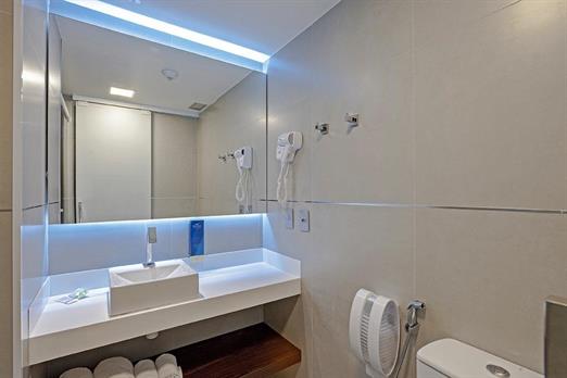 Suíte com cama de casal, TV 32”, tomada USB, wi-fi, ar-condicionado central e duas águas cortesia por acomodação. Não inclui café da manhã.