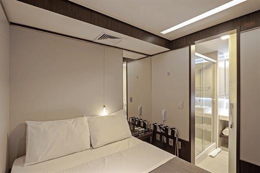 Cabine com cama de casal, TV 32'', wi-fi, ar-condicionado central e duas águas cortesia por acomodação. O banheiro externo individual utiliz...