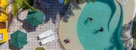 Piscina externa adulto e infantil, com banheiros privativos e deck.