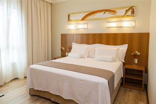 Apartamentos de 25 m² com uma cama queen size, piso vinílico, mesa de trabalho e TV Smart.