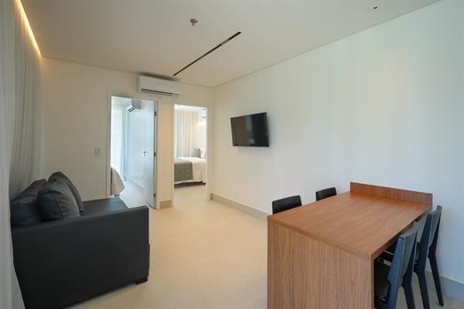 Apartamento de 62,82m² com ambiente de cozinha americana e sala integrados, sala com sofá cama, Smart TV 40” e ar condicionado, cozinha com...