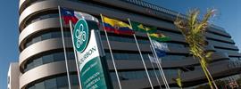 Apartamentos de 43 m² com vista frontal (Conmebol), uma cama queen size ou duas camas de casal. Opções para pessoas com deficiência.