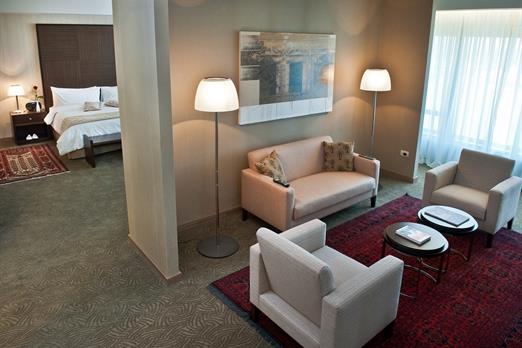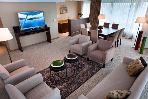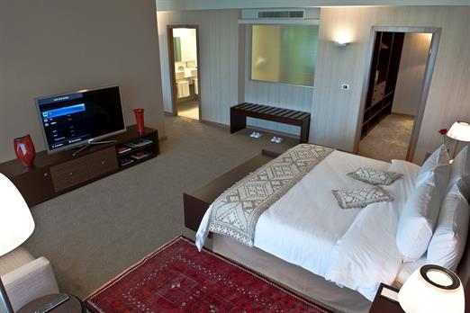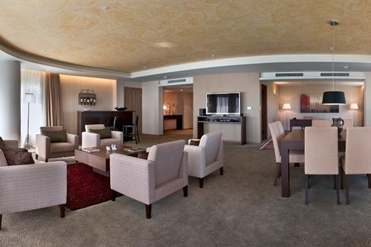 Suíte de 174 m² com terraço, sala com vista panorâmica, cama king size na suíte principal e camas twin na secundária.