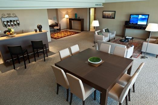 Suíte de 113 m² com sala com vista panorâmica e banheira de hidromassagem.