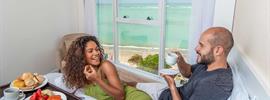 Este quarto possui, aproximadamente, 25 m² e tem vista frontal para o mar. É configurado para até três adultos e tem apenas duas camas, send...