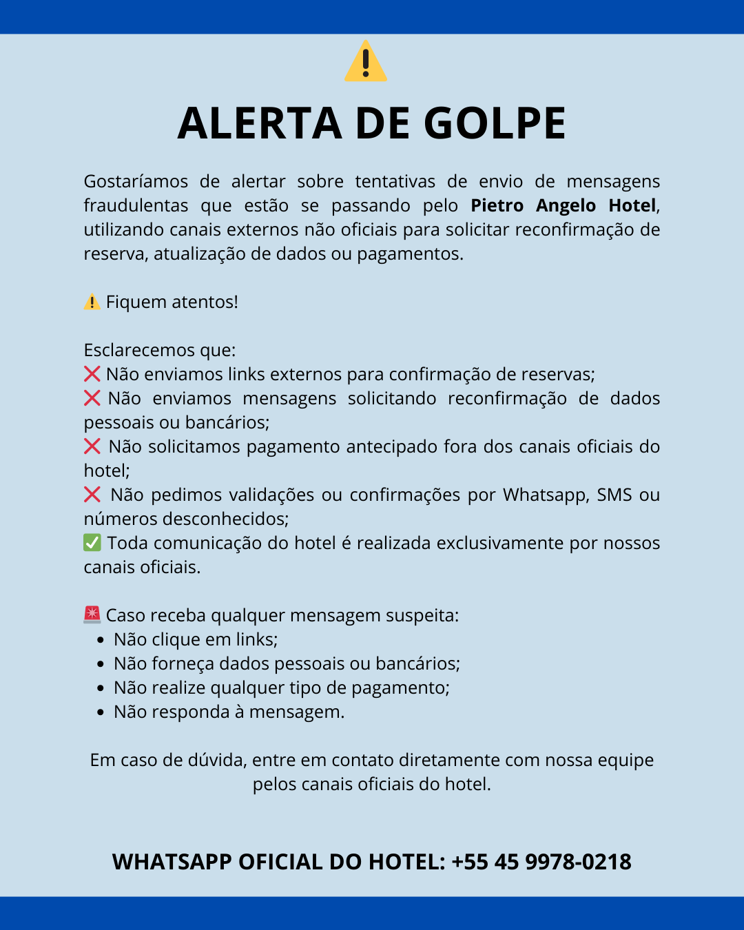 ▪️Os dados do voo deverão ser informados para central de reservas do hotel por escrito por e-mail: [email protected] ou Whatsapp: +55 45 9978-0218 com até 72 horas de antecedência.