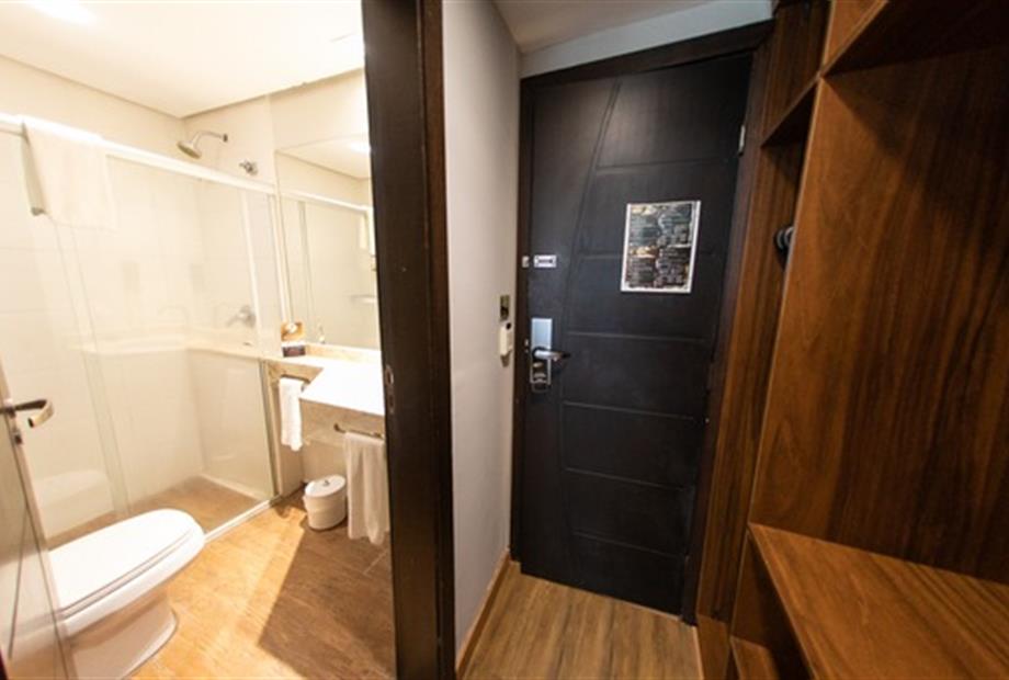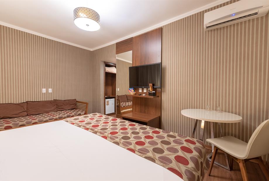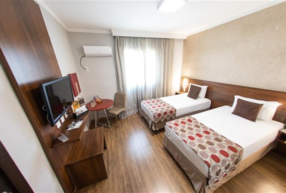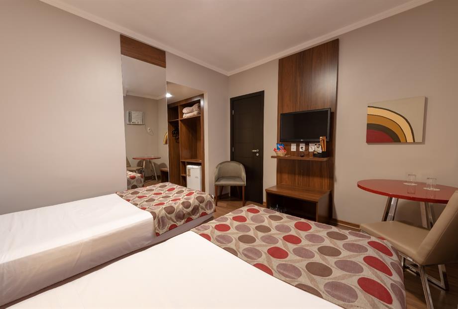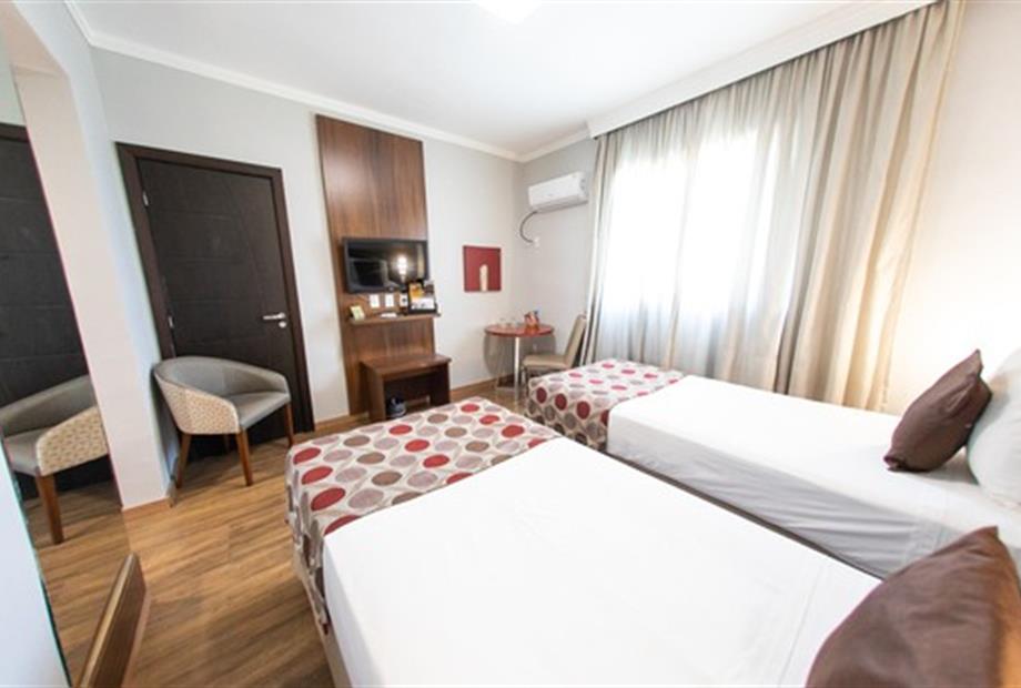 Acomodação com Duas camas solteiro box, TV 32”, ar condicionado split, armário, telefone, frigobar e banheiro privativo.