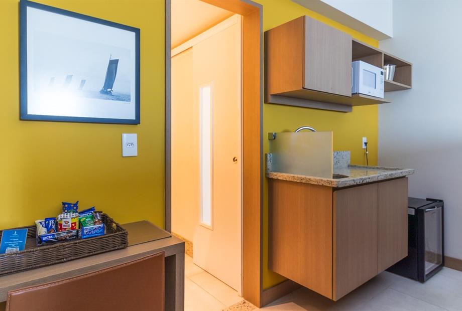 Como diferencial esta categoria oferece cozinha equipada com geladeira, microondas, pia com bancada em granito...