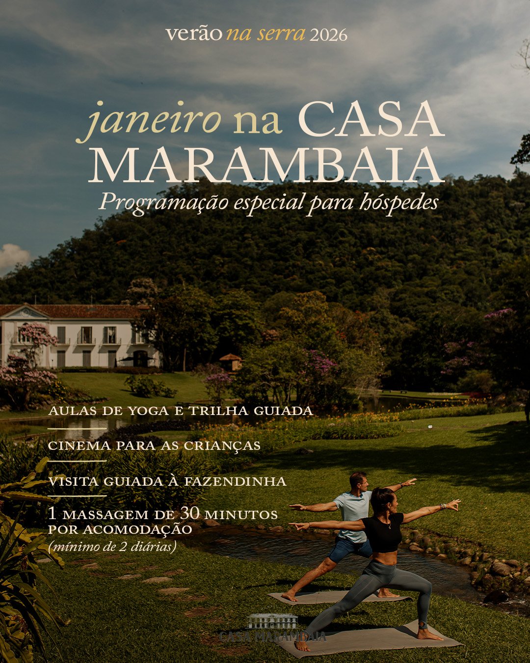Ver detalhe do quartoEscapada Gastronômica 🍷 R$150 de crédito gastronômico para você aproveitar durante a semana! Hospede-se na Casa Marambaia de domingo a quinta-feira e GANHE um presente especial para os amantes da boa gastronomia. Ao reservar sua estadia durante a semana, você recebe R$150 de crédito exclusivo para viver uma experiência única no restaurante Bonaccia, com curadoria do premiado chef Rafa Costa e Silva. 🍽️ Sabores autorais, ingredientes frescos e um ambiente sofisticado em meio à natureza da serra. Uma verdadeira imersão sensorial que vai muito além da refeição. 📍 Válido de domingo a quinta-feira. Garanta sua reserva e saboreie o melhor da Casa Marambaia. *O valor deve ser utilizado durante a estada **Não é cumulativo entre as diárias.