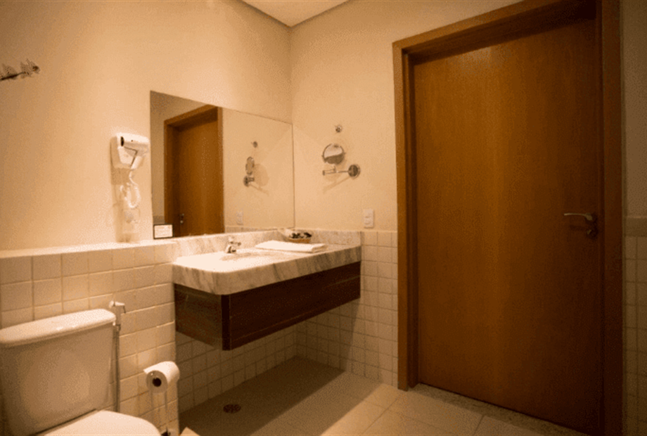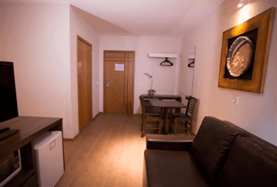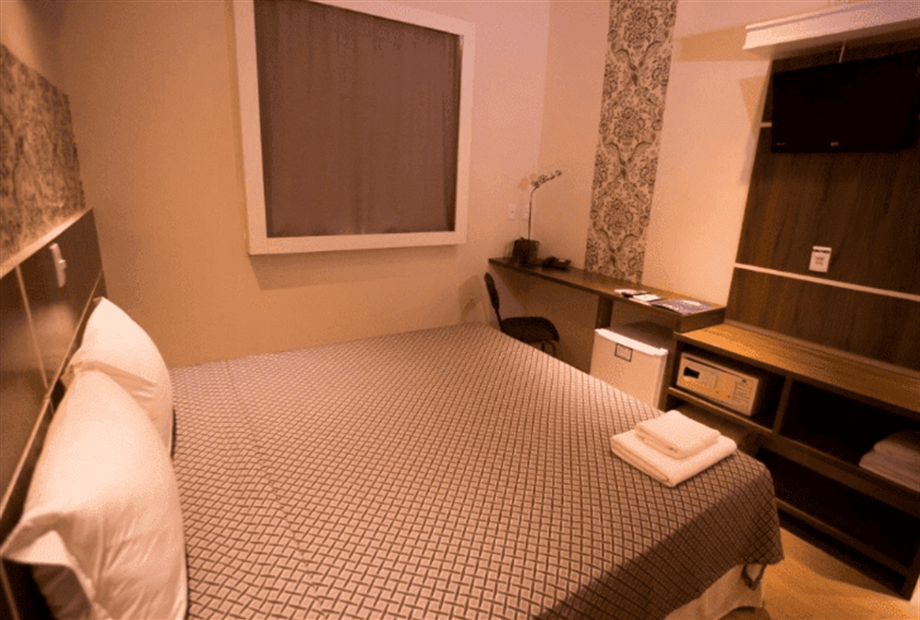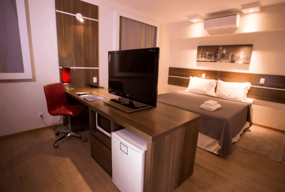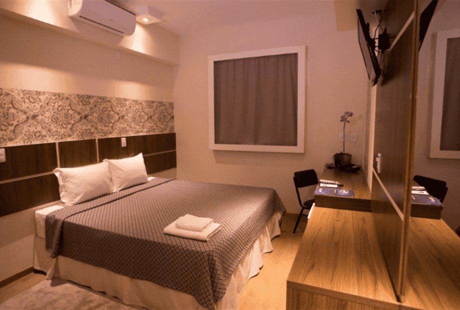 TV 24’’com tv a cabo; Ar condicionado Split; Mesa de trabalho; Frigobar; Internet Wi-Fi cortesia; Cofre; Telefone com discagem direta;