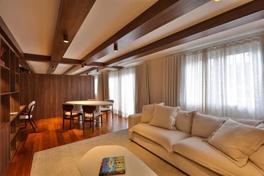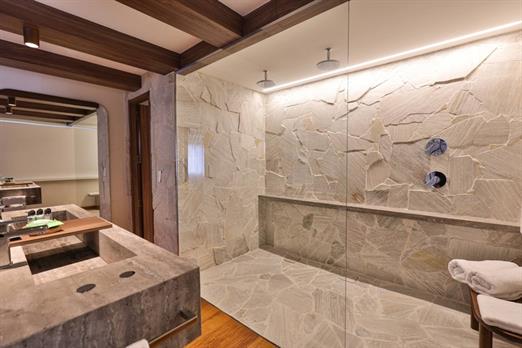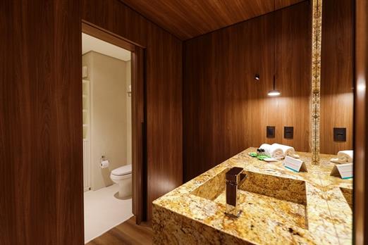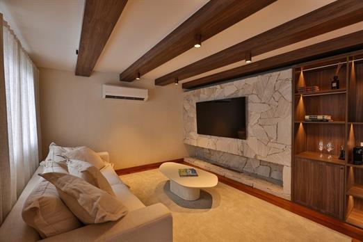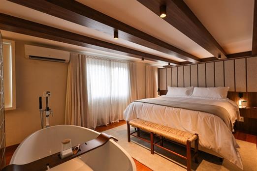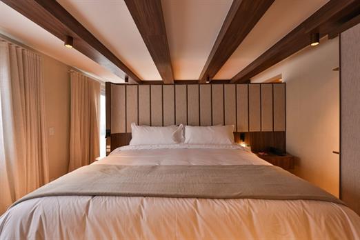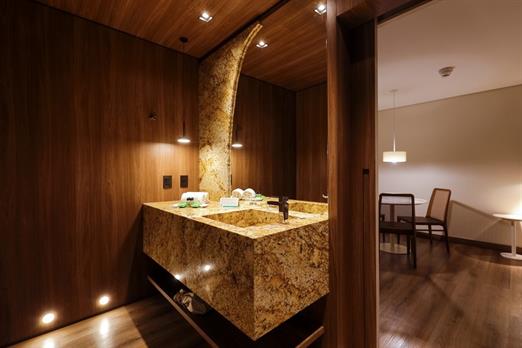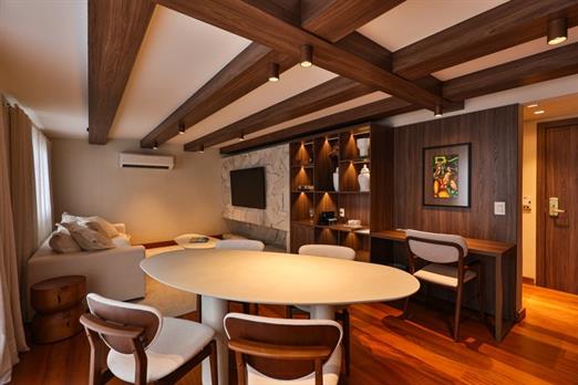 Suítes clássicas com 47 m² distribuídos em quarto com cama King Size, closet, banheiro com cuba dupla externa, sala de estar e varanda. Acom...