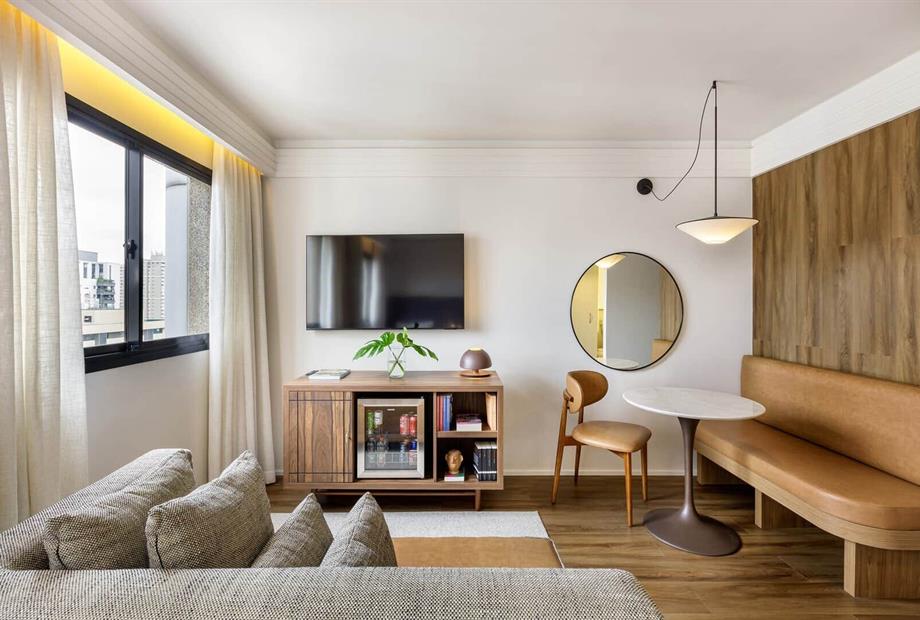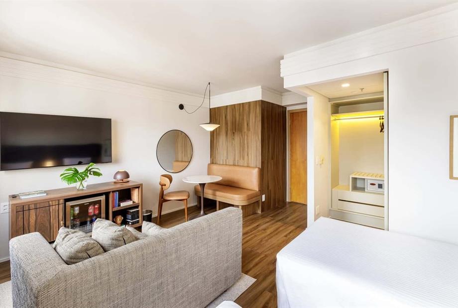 Os quartos tem 28 m² com piso vinílico amadeirado, tapete hipoalergênico, e cama king size. Todos possuem ar-condicionado, móvel bar com min... (ver mais)