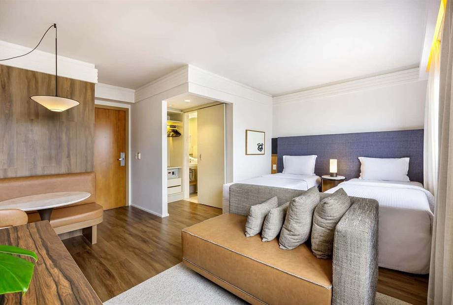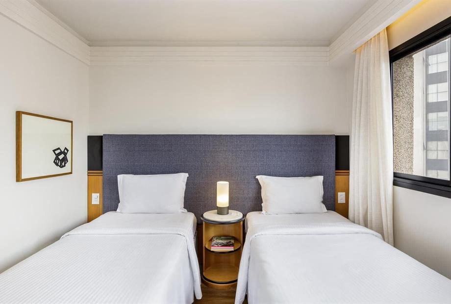 Os quartos tem 28m² com piso vinílico amadeirado, tapete hipoalergênico, e duas camas twin size. Todos possuem ar-condicionado, móvel bar co... (ver mais)