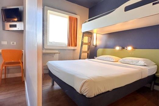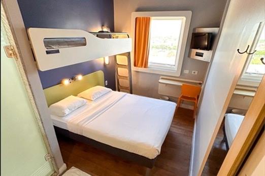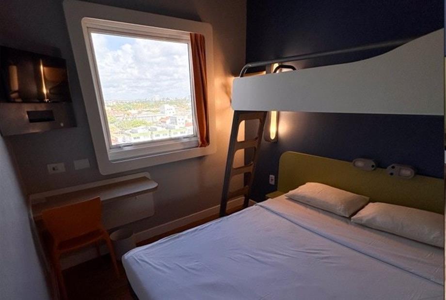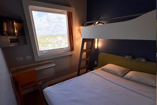 Apartamento com uma cama casal e uma de solteiro sobreposta.