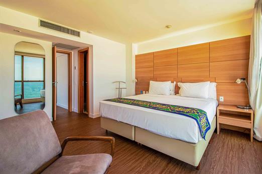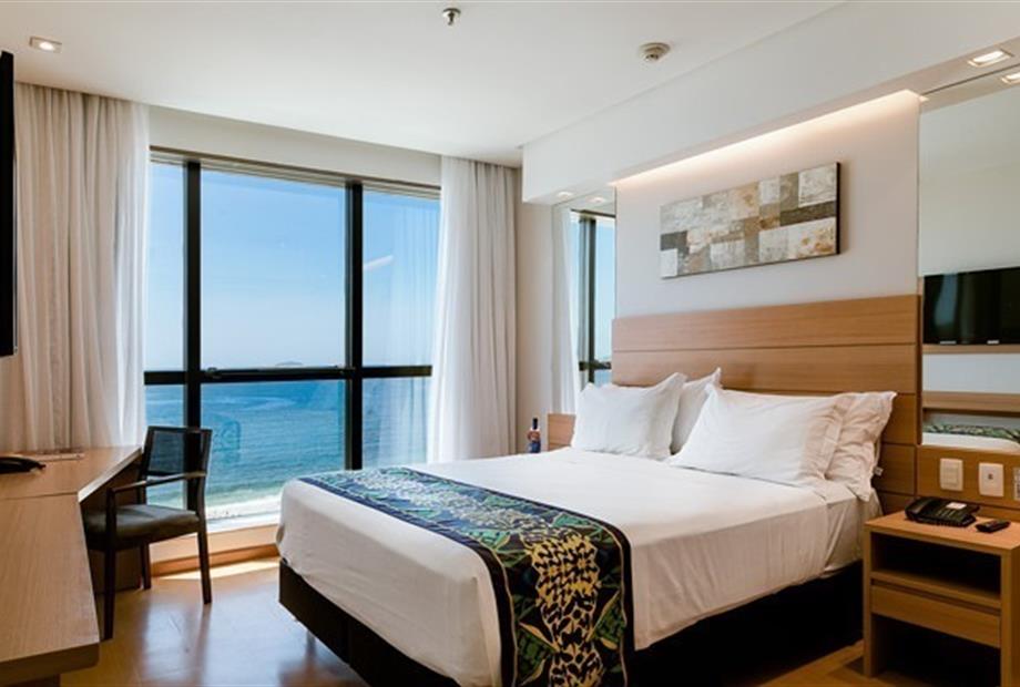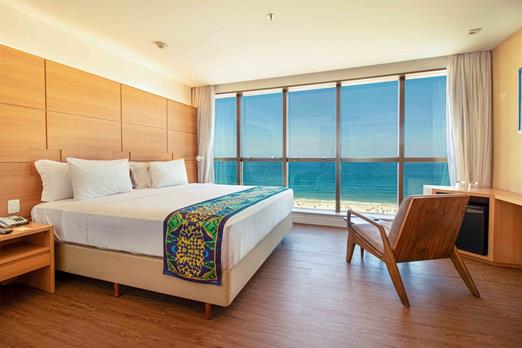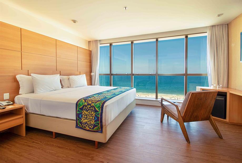 Suíte com cama casal, com vista dupla incrível da praia que acomoda 2 adultos + 1 criança até 2 anos acomodada em berço ou nas camas existen...