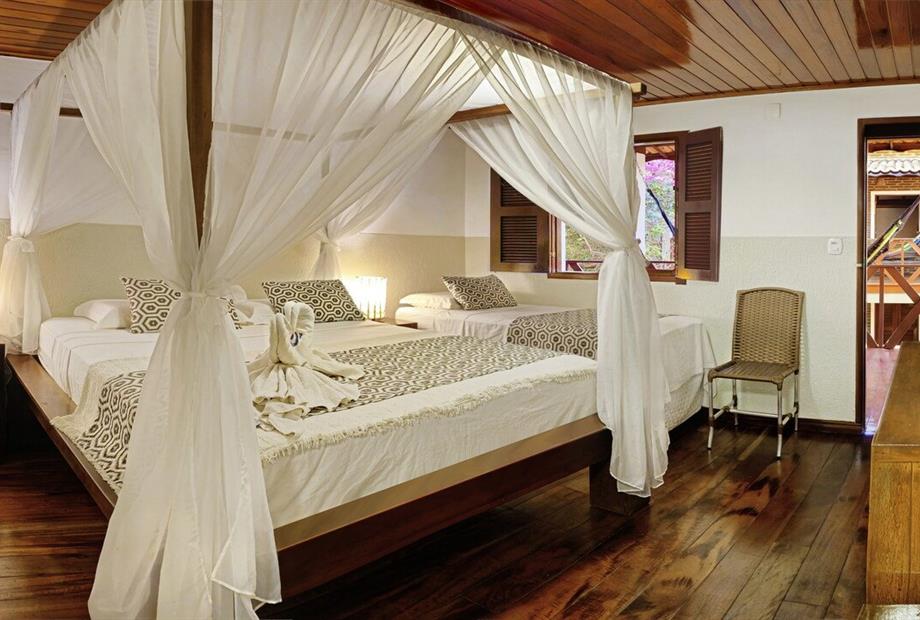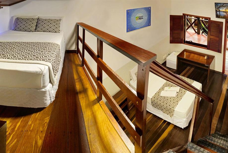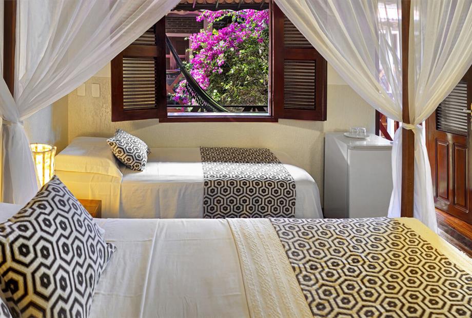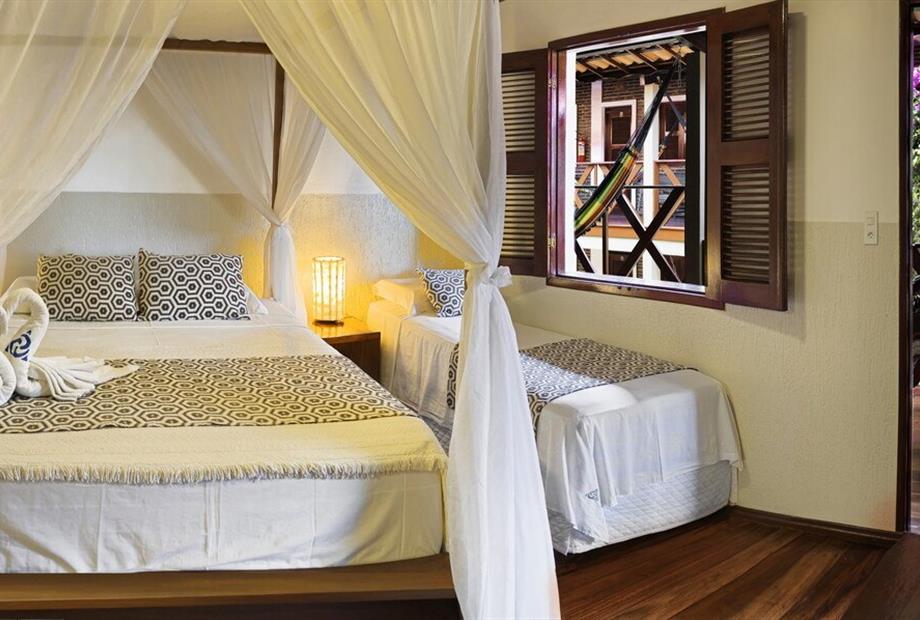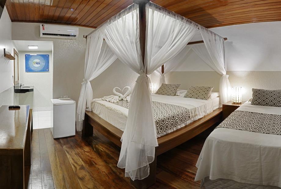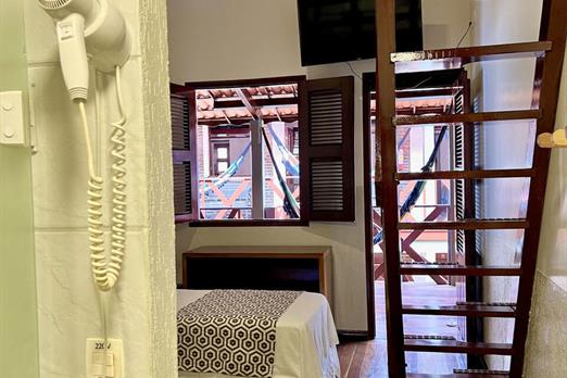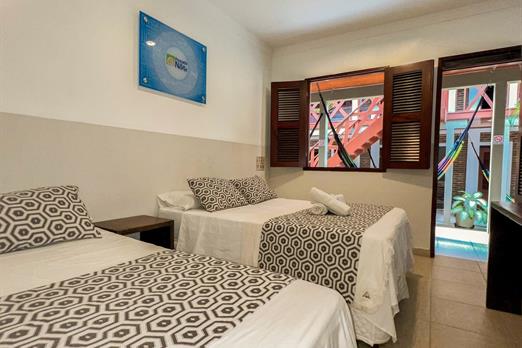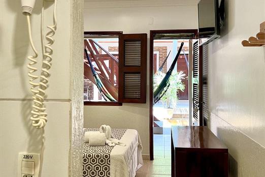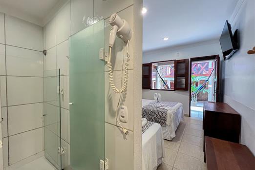 Quarto equipado com cama box, TV 42", Ar-condicionado, frigobar, banheiro privativo com ducha quente, secador de cabelo e varanda com rede c...