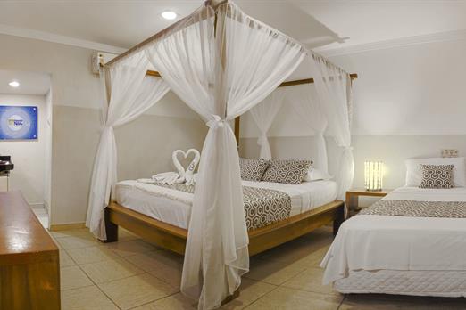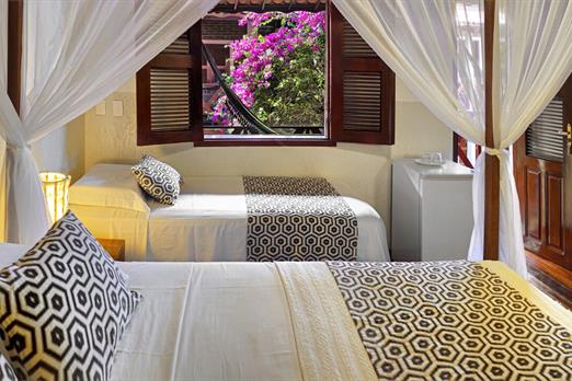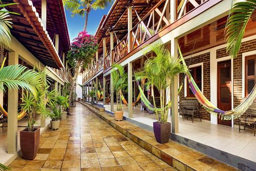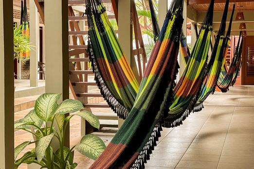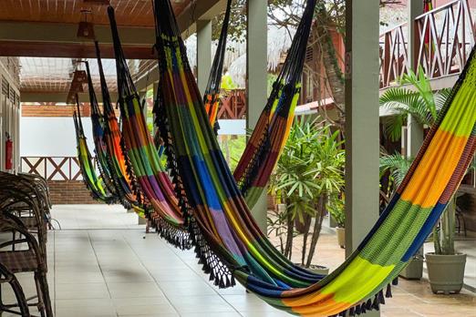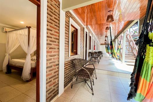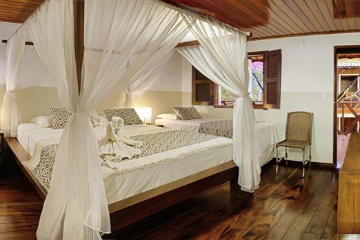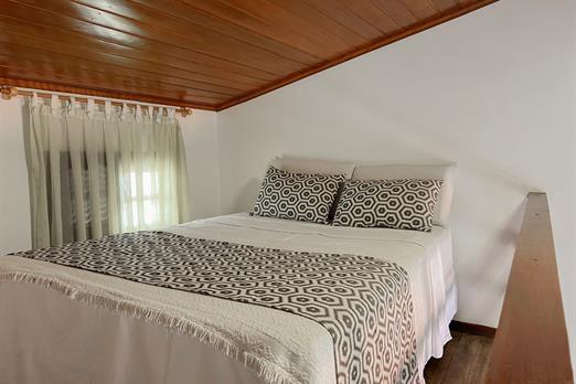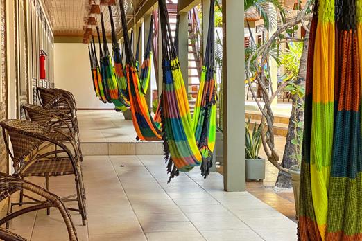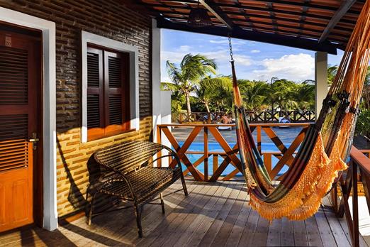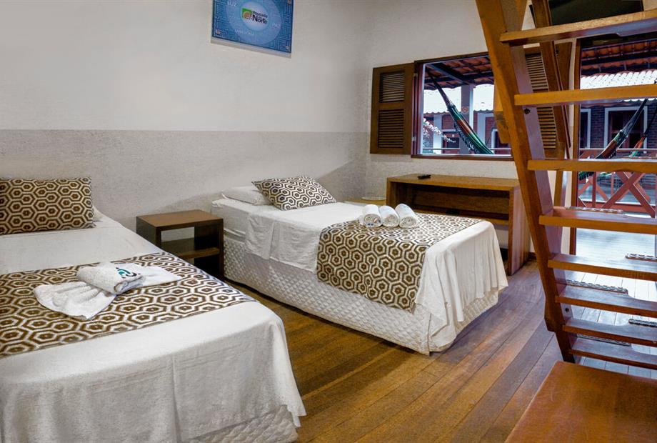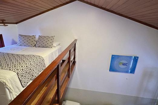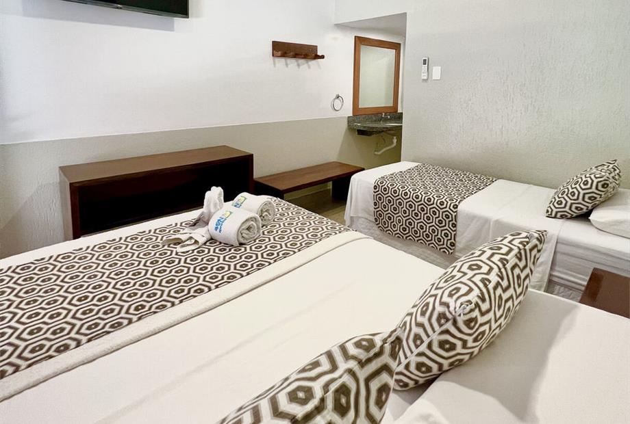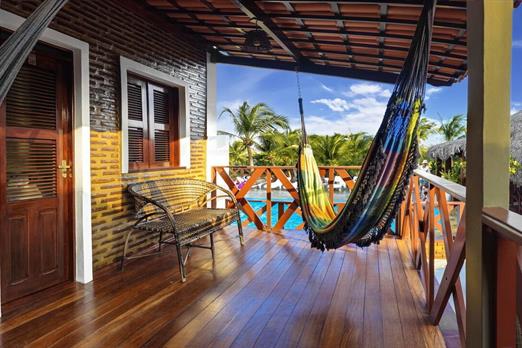Quarto equipado com cama box, TV 42", Ar-condicionado, frigobar, banheiro privativo com ducha quente, secador de cabelo e varanda com rede c...