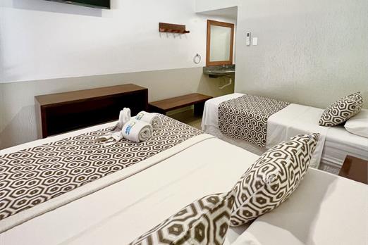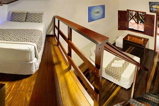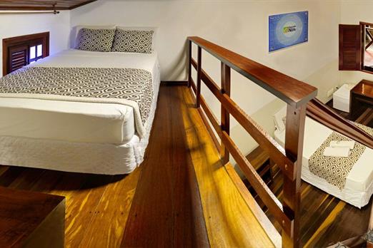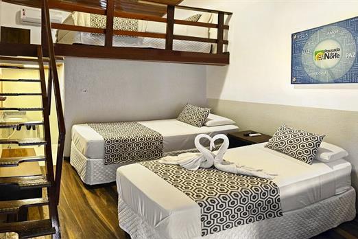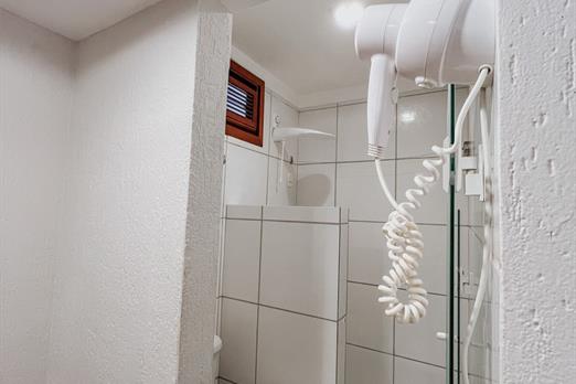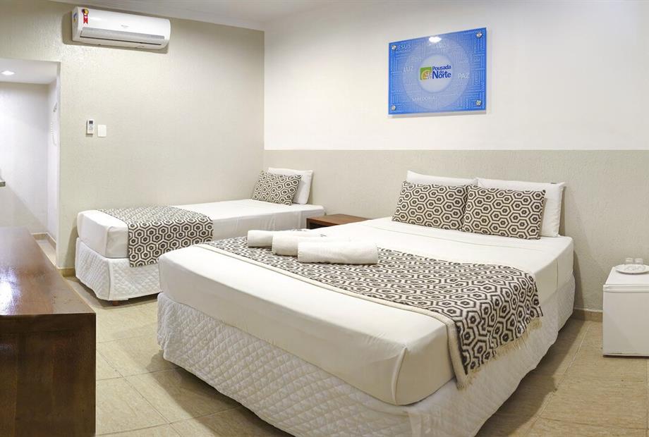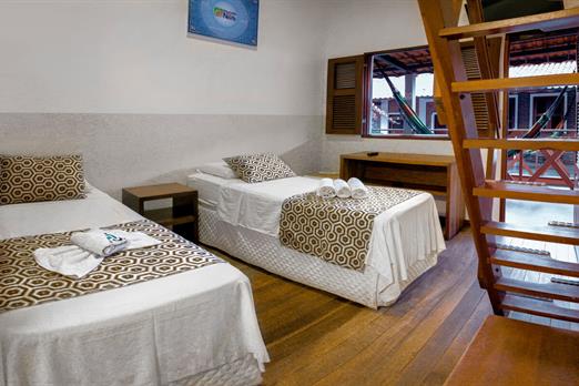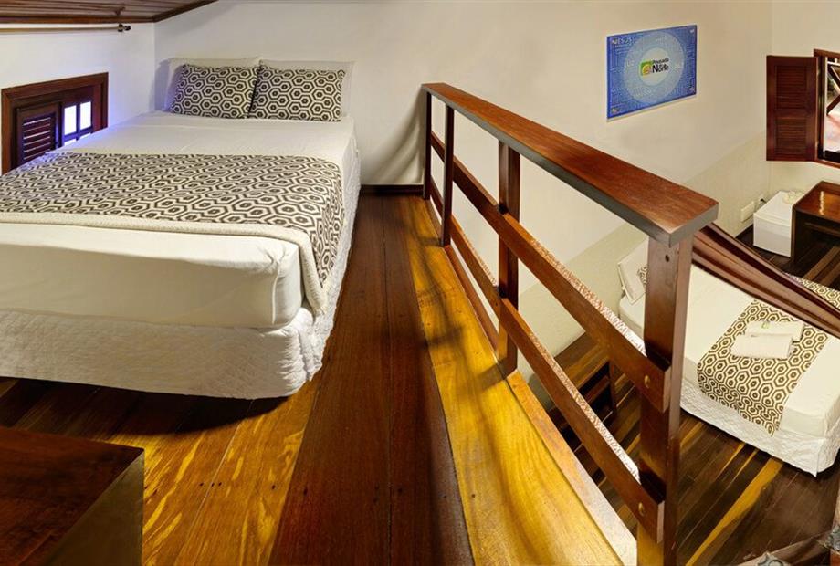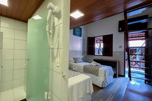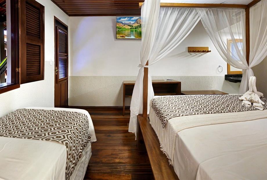 Ver detalhe do quartoTarifário Base Pousada com localização privilegiada, quartos padronizados com estilo rustico, equipados com cama box, TV LED de 42', ar-condicionado split, banheiro privativo com box blindex, secador de cabelo, ducha quente, frigobar e internet Wi-Fi de alta velocidade.