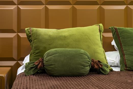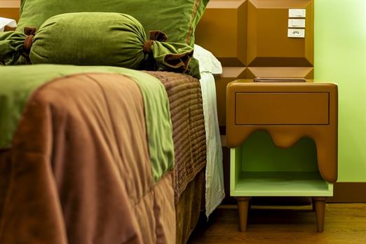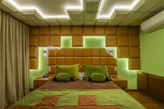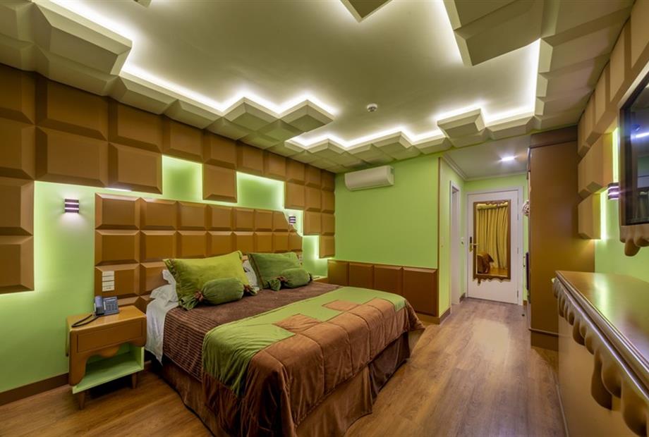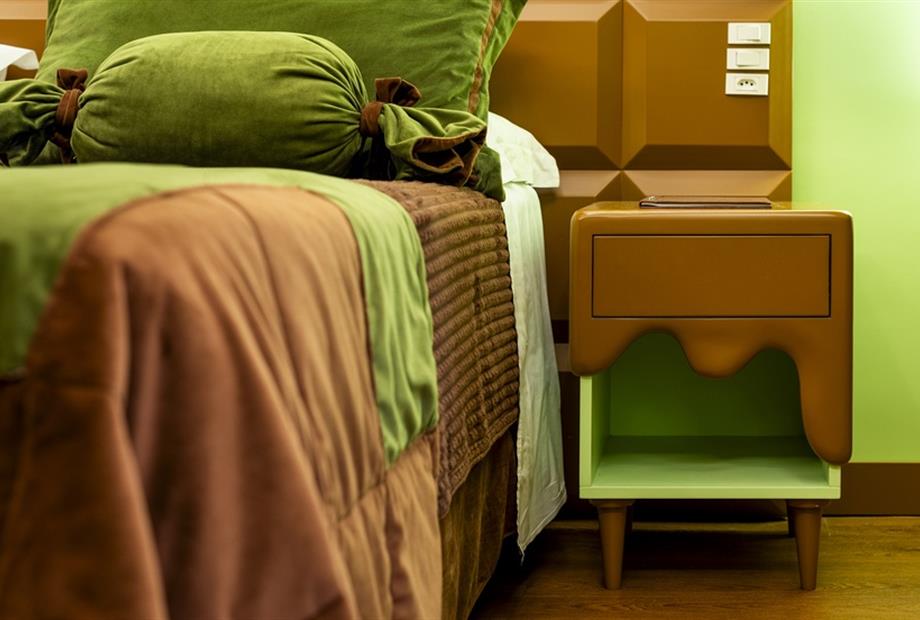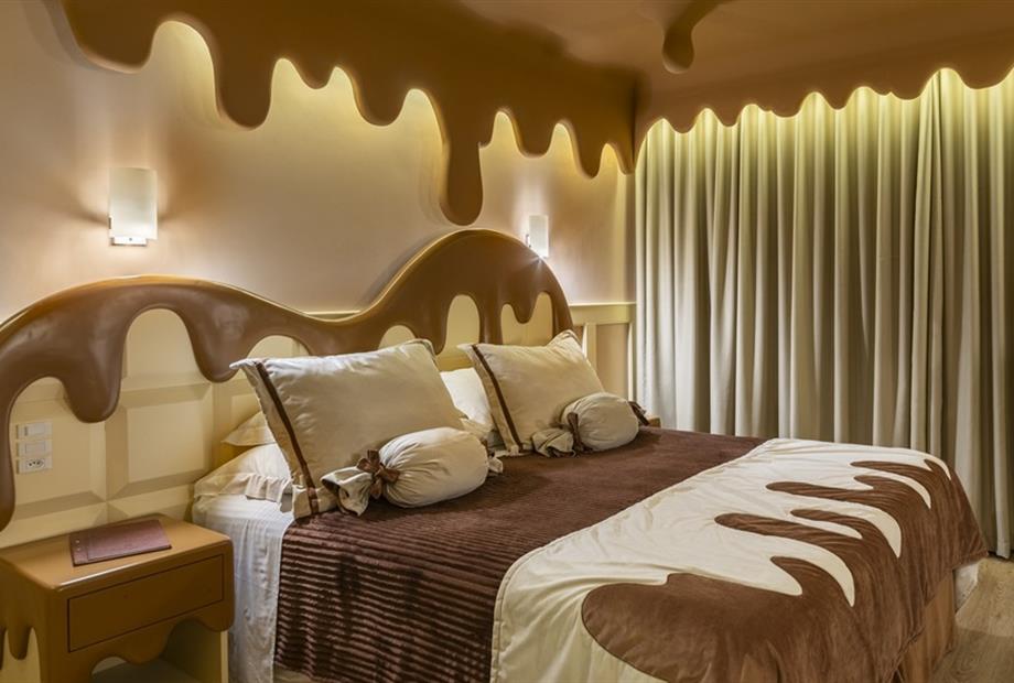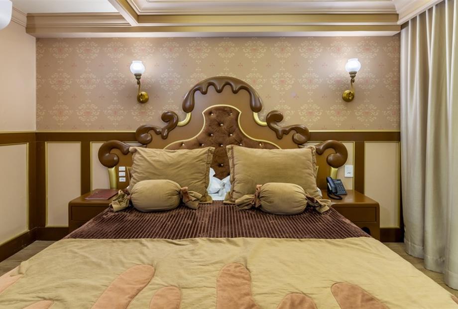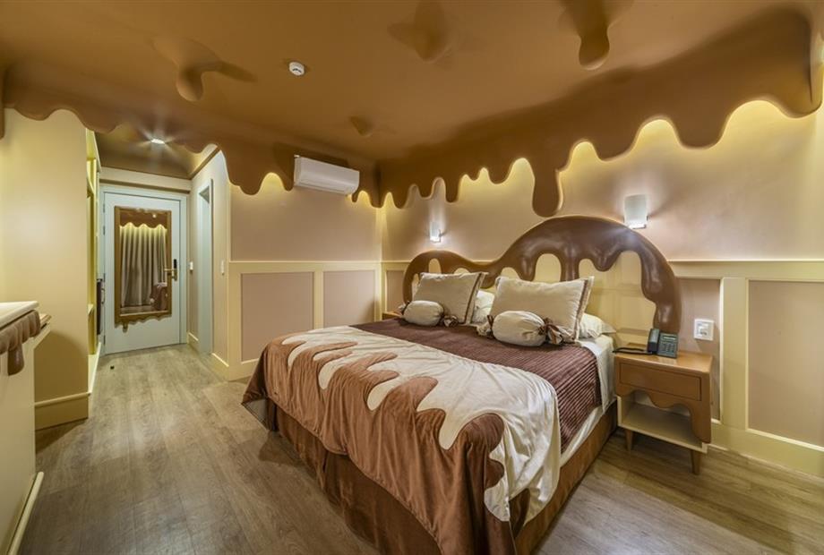 Esta suíte foi criada para quem ama chocolate! Sua inspiração vem das tradicionais barras de chocolate preto que cobrem o teto, paredes, mob...