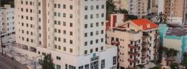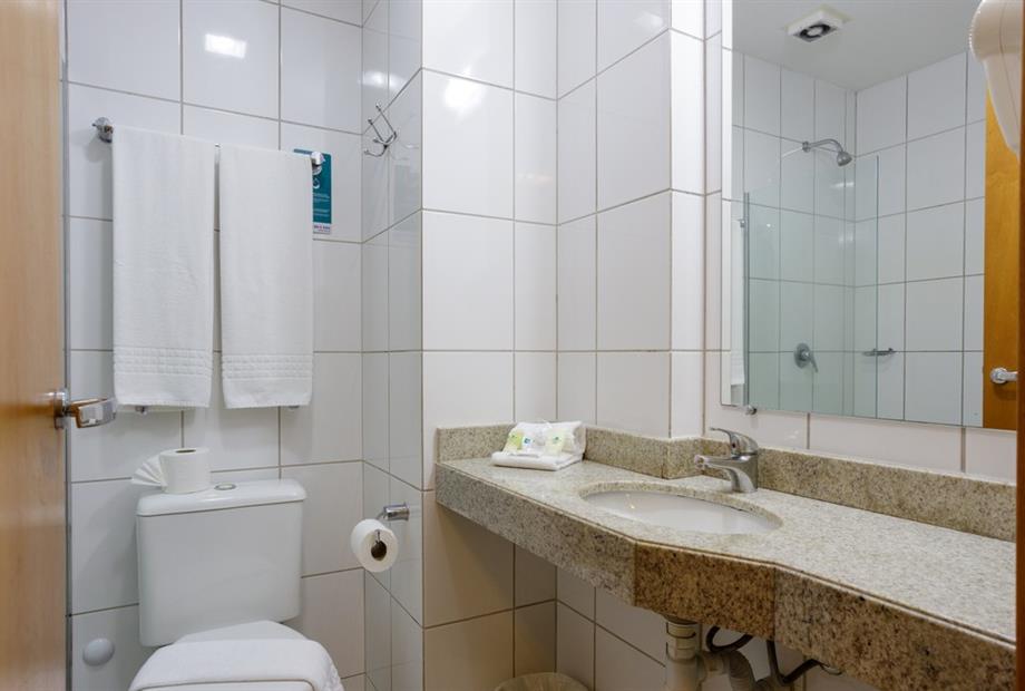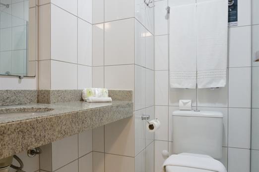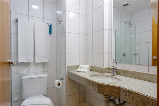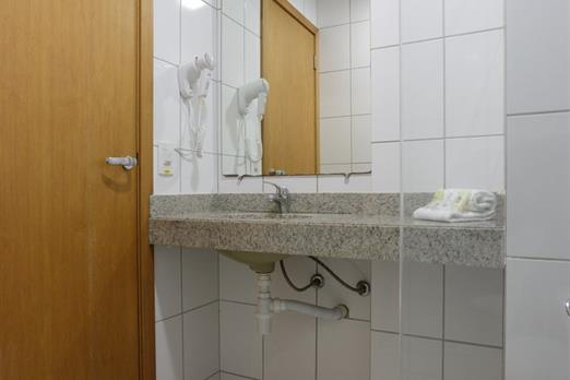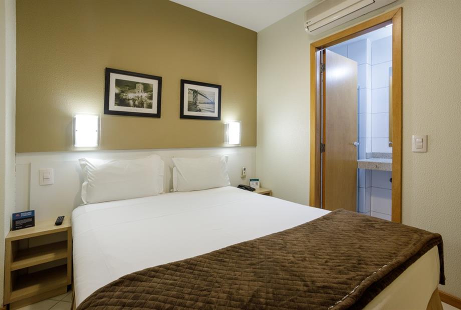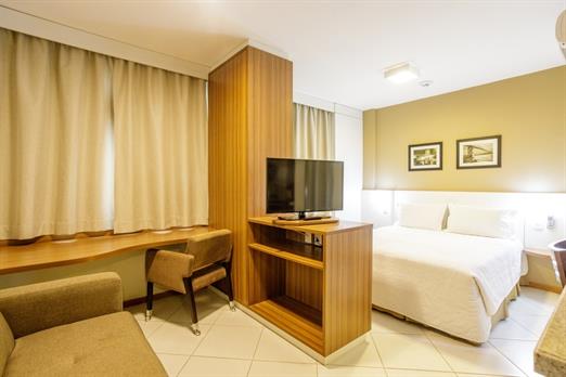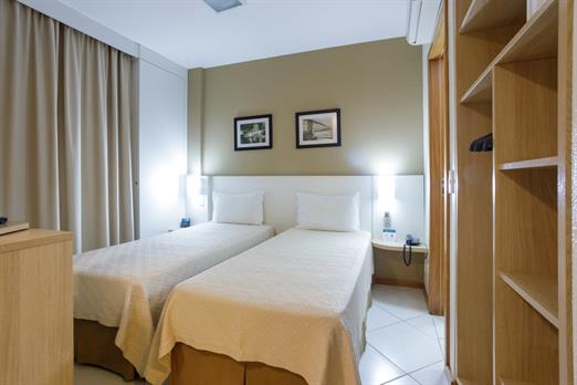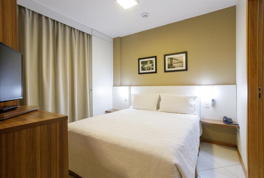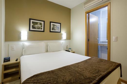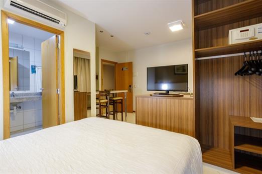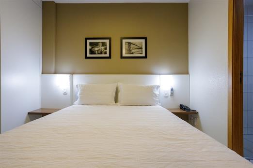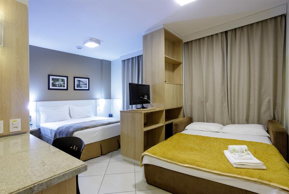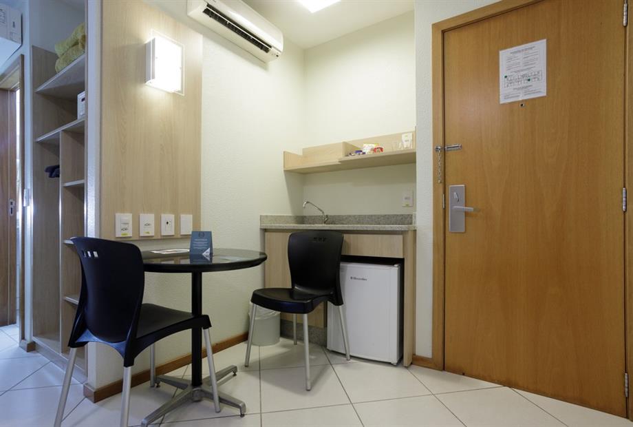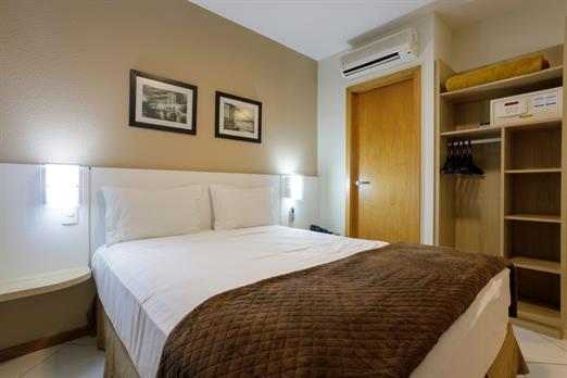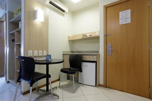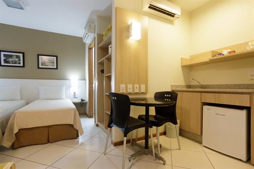 Apartamento de 24m² com duas camas de solteiro, copa, frigobar, ar-condicionado, mesa de trabalho e TV a cabo. Voltagem elétrica 220v. *Terc...