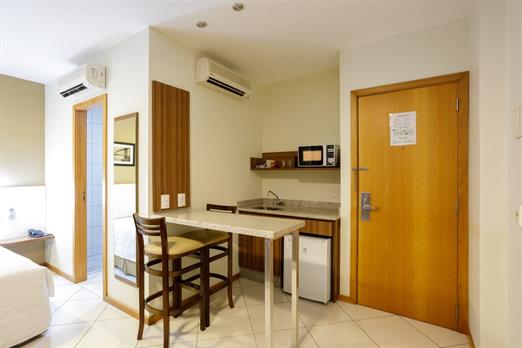 Apartamento de 24m² totalmente adaptado, dispõe de frigobar, ar-condicionado, sofá cama, TV a cabo e cofre.