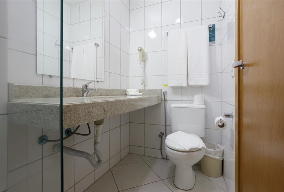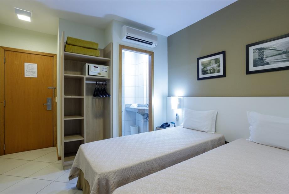 Apartamento de 15m² com duas camas de solteiro, frigobar, ar-condicionado, mesa de trabalho e TV a cabo. Voltagem elétrica 220v.