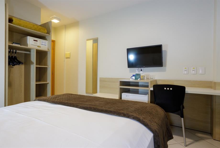 Apartamento de 15m² com cama casal, frigobar, ar-condicionado, mesa de trabalho e TV a cabo. Voltagem elétrica 220v.