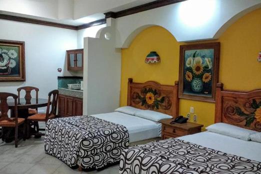 Habitación doble con utensilios de cocina, aire acondicionado y cocina.