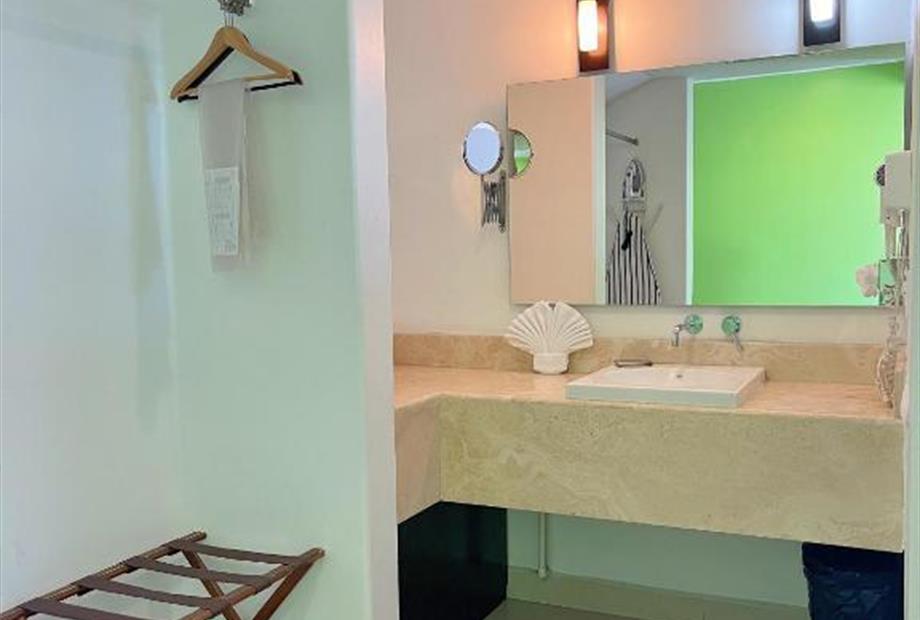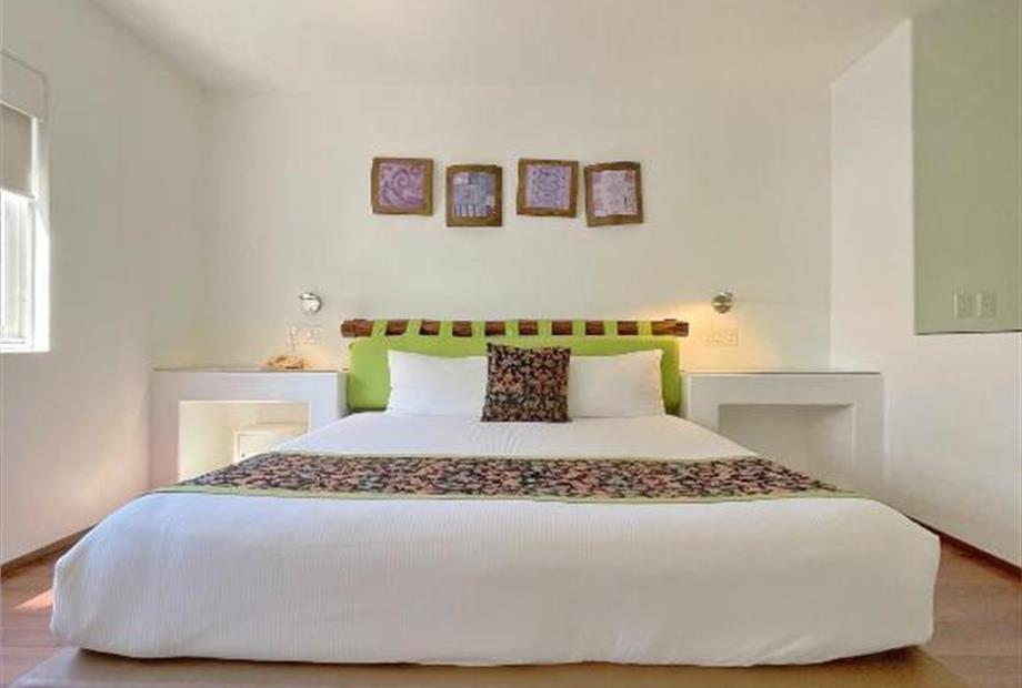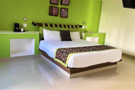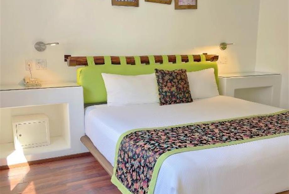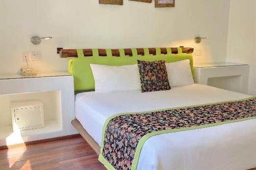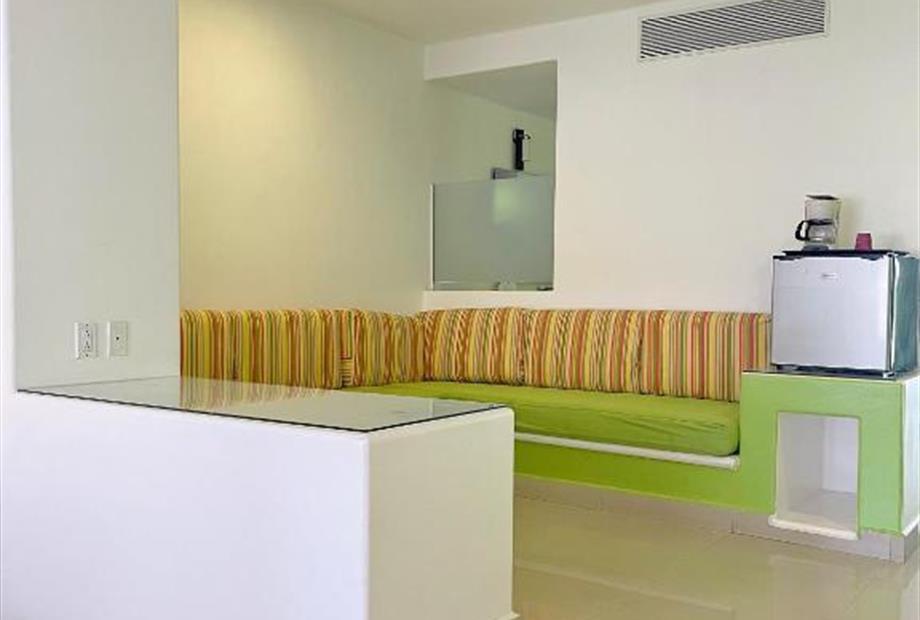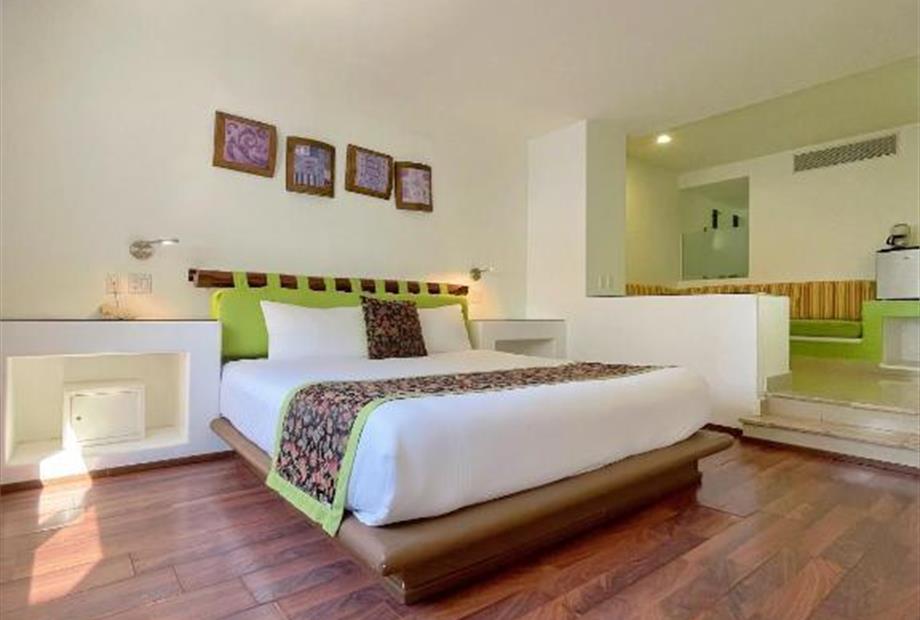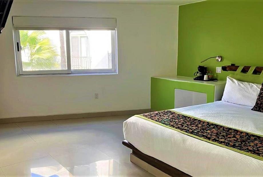 Habitacion con una cama king size, sala, baño privado, TV por cable, WiFi, Aire acondicionado, secado de cabello, frigobar, cafetera.