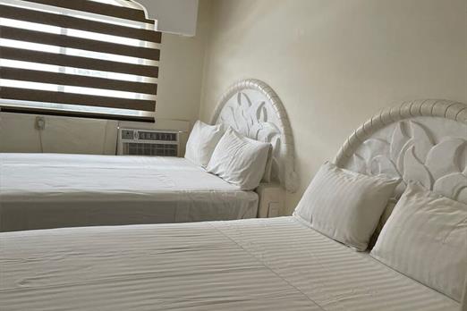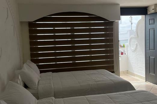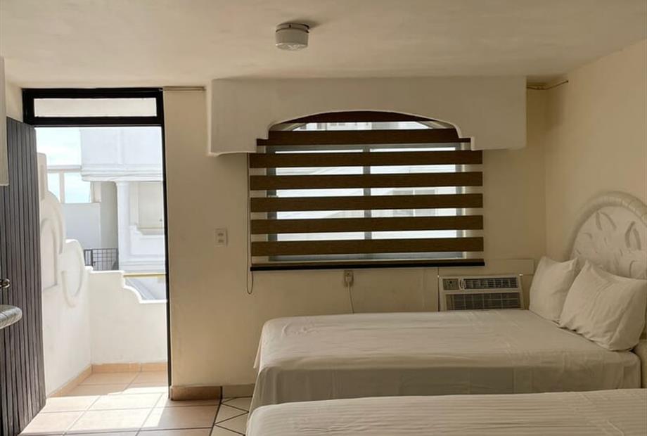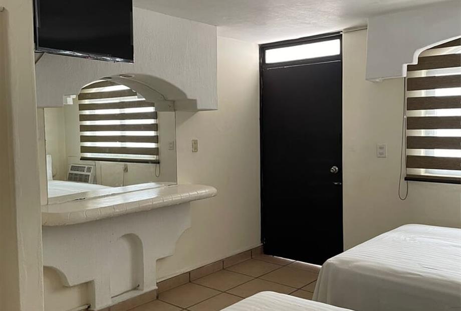 Habitación con 2 camas matrimoniales, baño privado, agua caliente, aire acondicionado, tv por cable, cocineta y amenidades.