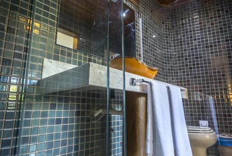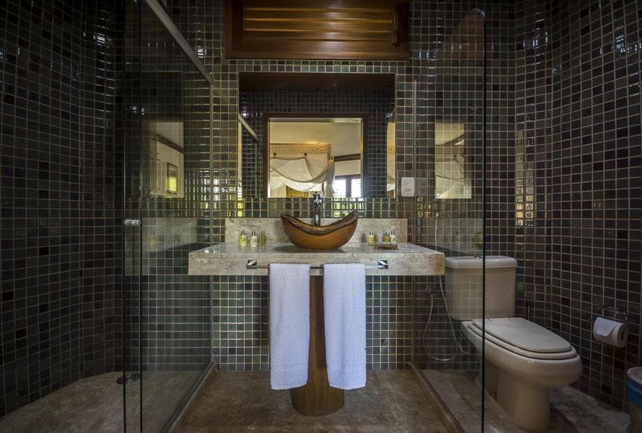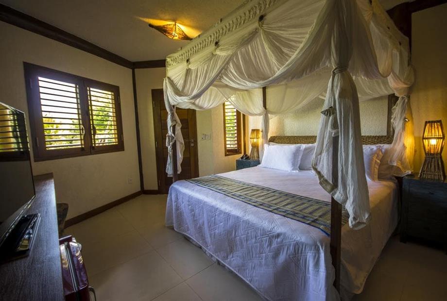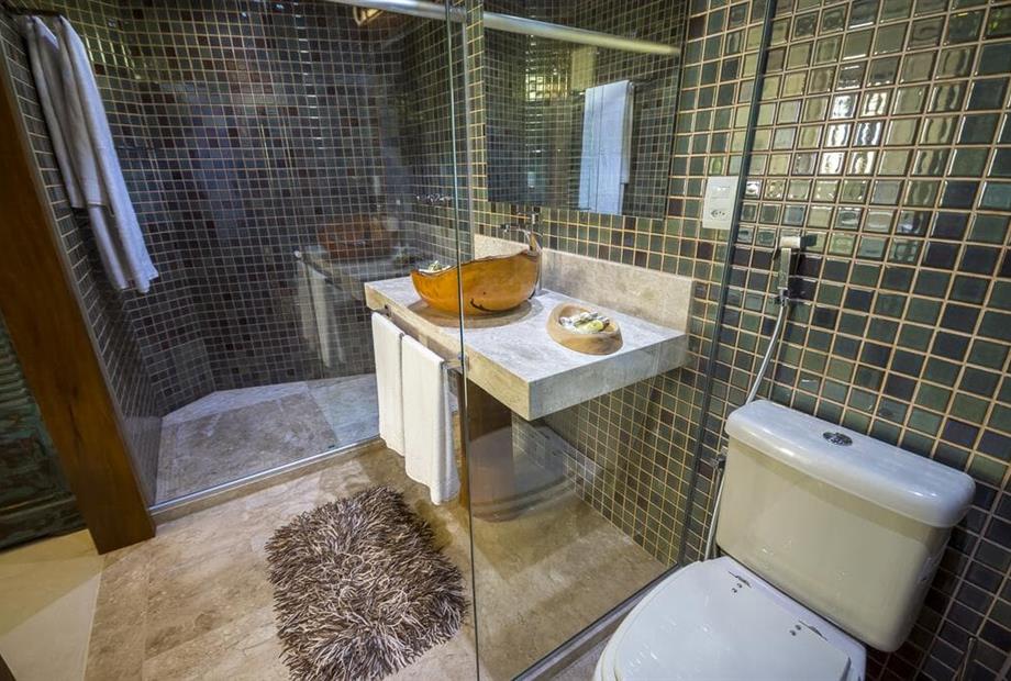 Suites ampla com 25m², vista para o jardim tropical e piscina, equipadas com, TV de plasma 42 polegadas, SKY, cama king size, Split 12 BTU`s...
