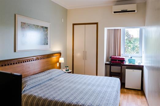 Apto Individual com cama box casal (1,38 m), ar-condicionado split, rack lateral com TV LCD com canais a cabo, frigobar, telefone (discagem...